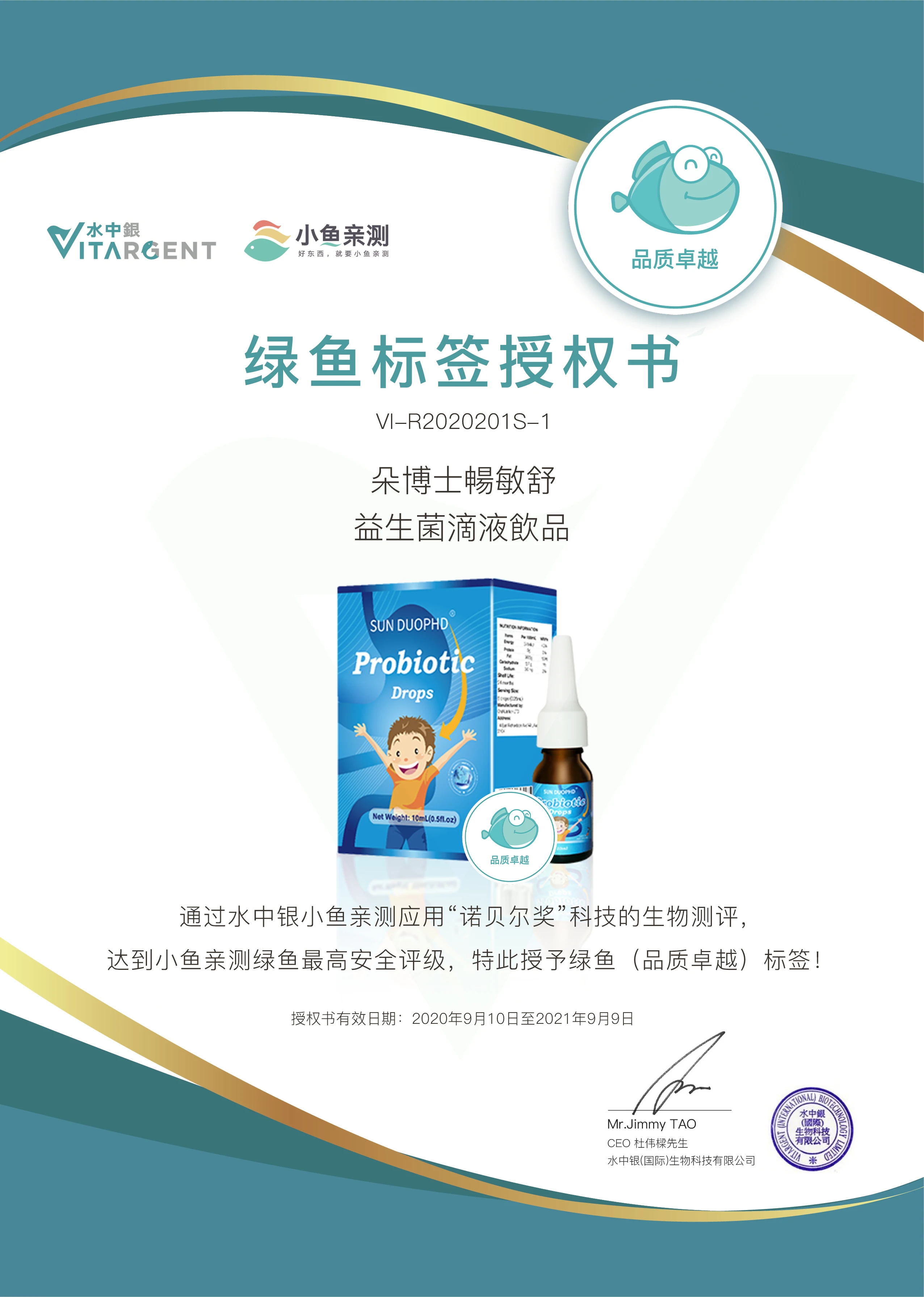 并获得小鱼亲测绿鱼标签授权书