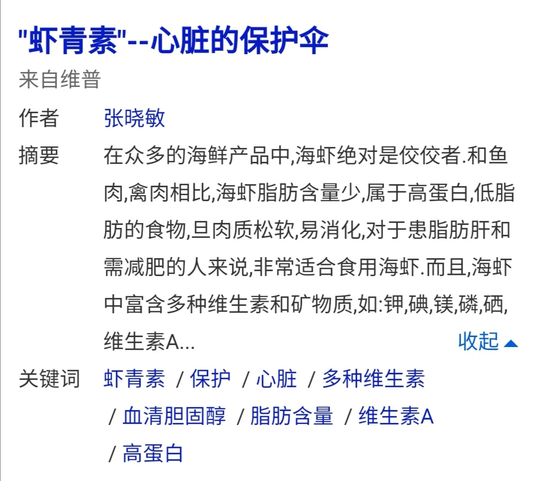 另外,上海交通大学医学院附属仁济医院临床营养科主治医师张晓敏在《虾青素---心脏的保护伞》中提到,虾青素是较强功效的抗氧化剂之一,在提高免疫力,预防肿瘤、心血管疾病、糖尿病等慢性疾病的发生发展等方面具有一定作用。